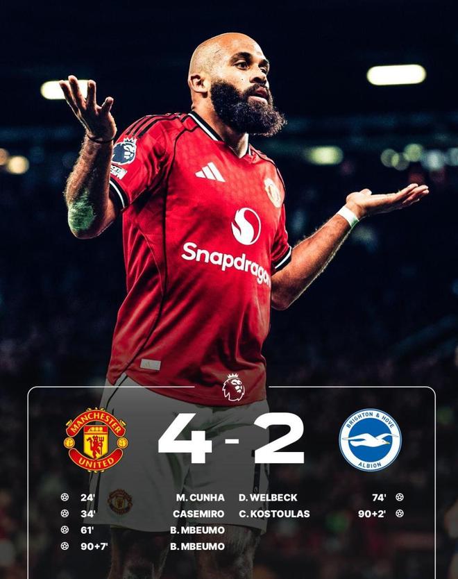 但在傷停補(bǔ)時(shí)第96分鐘,姆伯莫站了出來,單刀再下一城,梅開二度鎖定勝局,曼聯(lián)4-2布萊頓。